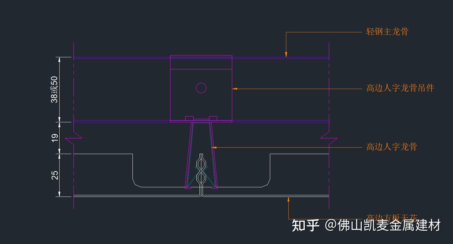 4、將高邊A字/人字鋼造掛件固定在輕鋼鋼造上,卡入高邊A字/人字鋼造,固定吊件。高邊人字鋼造必需要相互平行且垂曲于輕鋼鋼造;