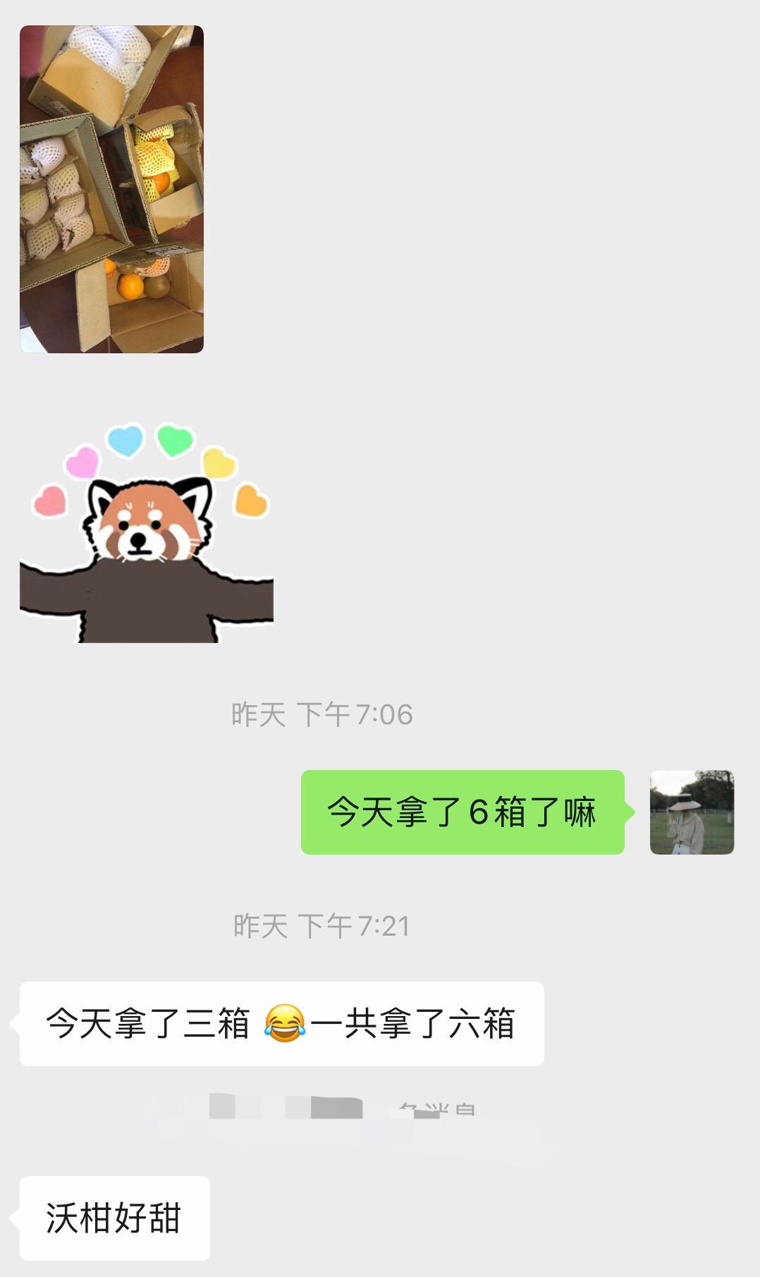 今天家中人去取了幾箱,我父母對梨子很滿意,發(fā)的溫州話語音沒法識別哈哈,次要就是夸梨子雖小很甜,味道不錯(cuò)我爸很喜好,送了一袋給外婆家。我妹妹也對橘子暗示承認(rèn)~
