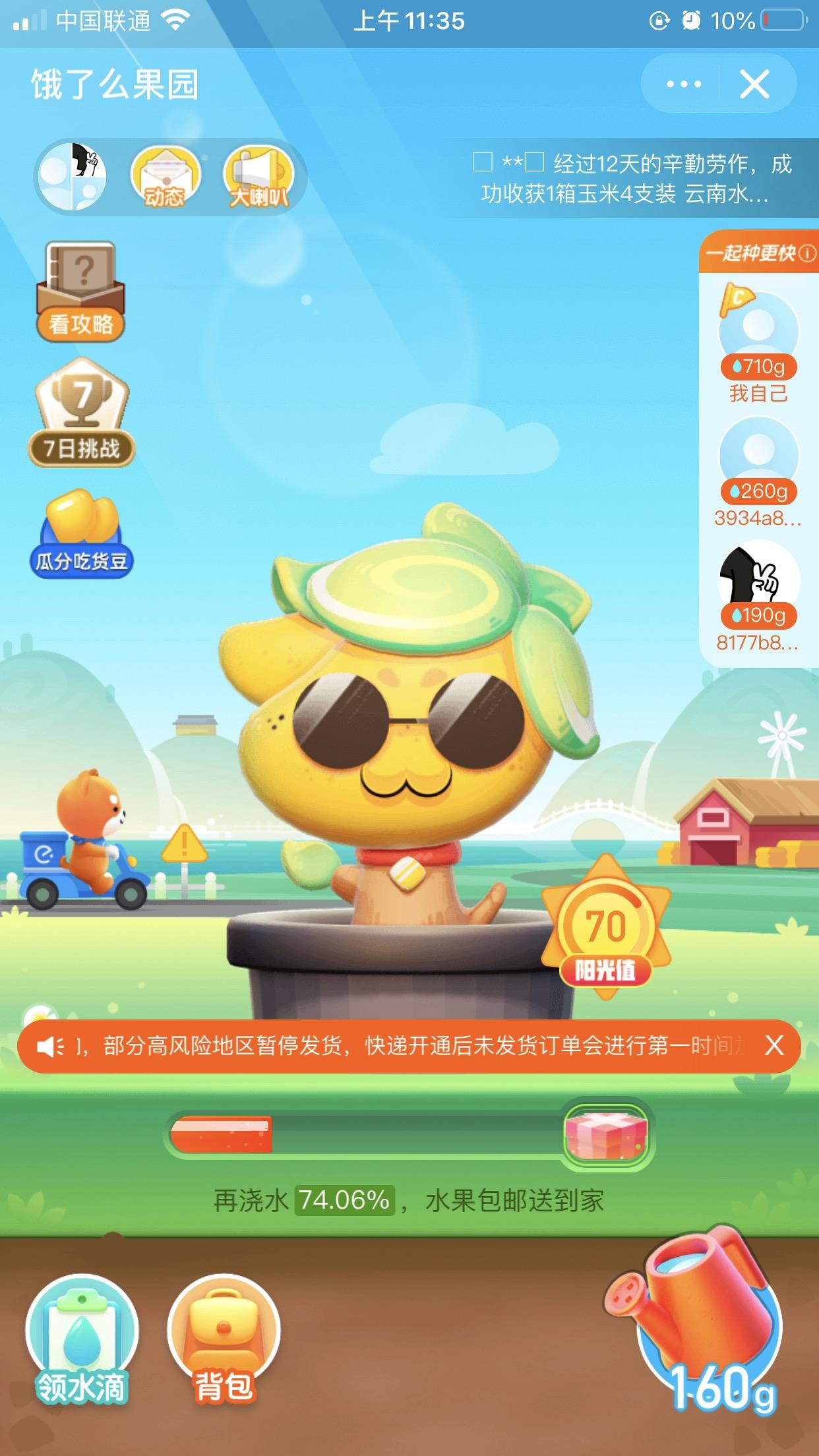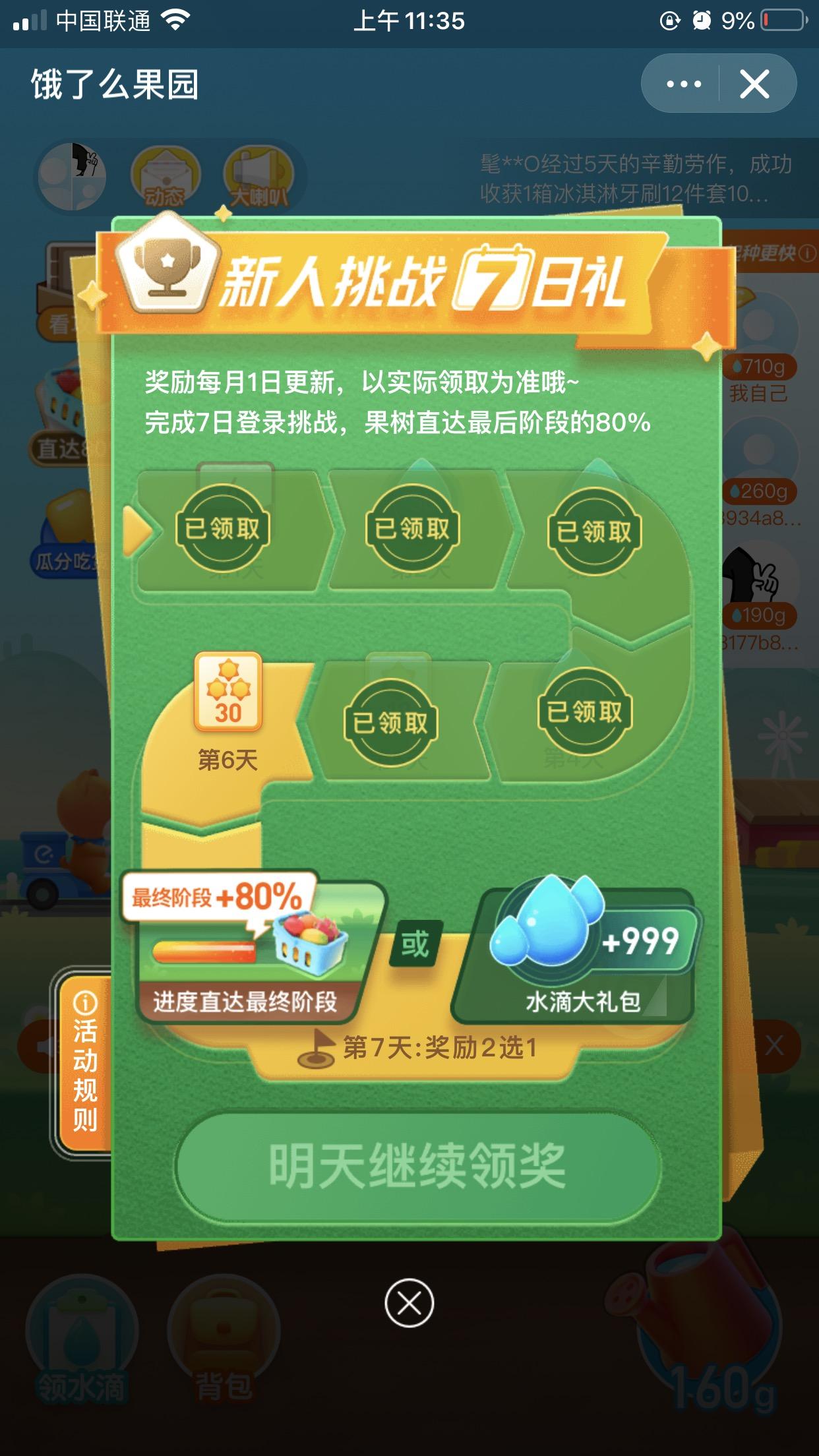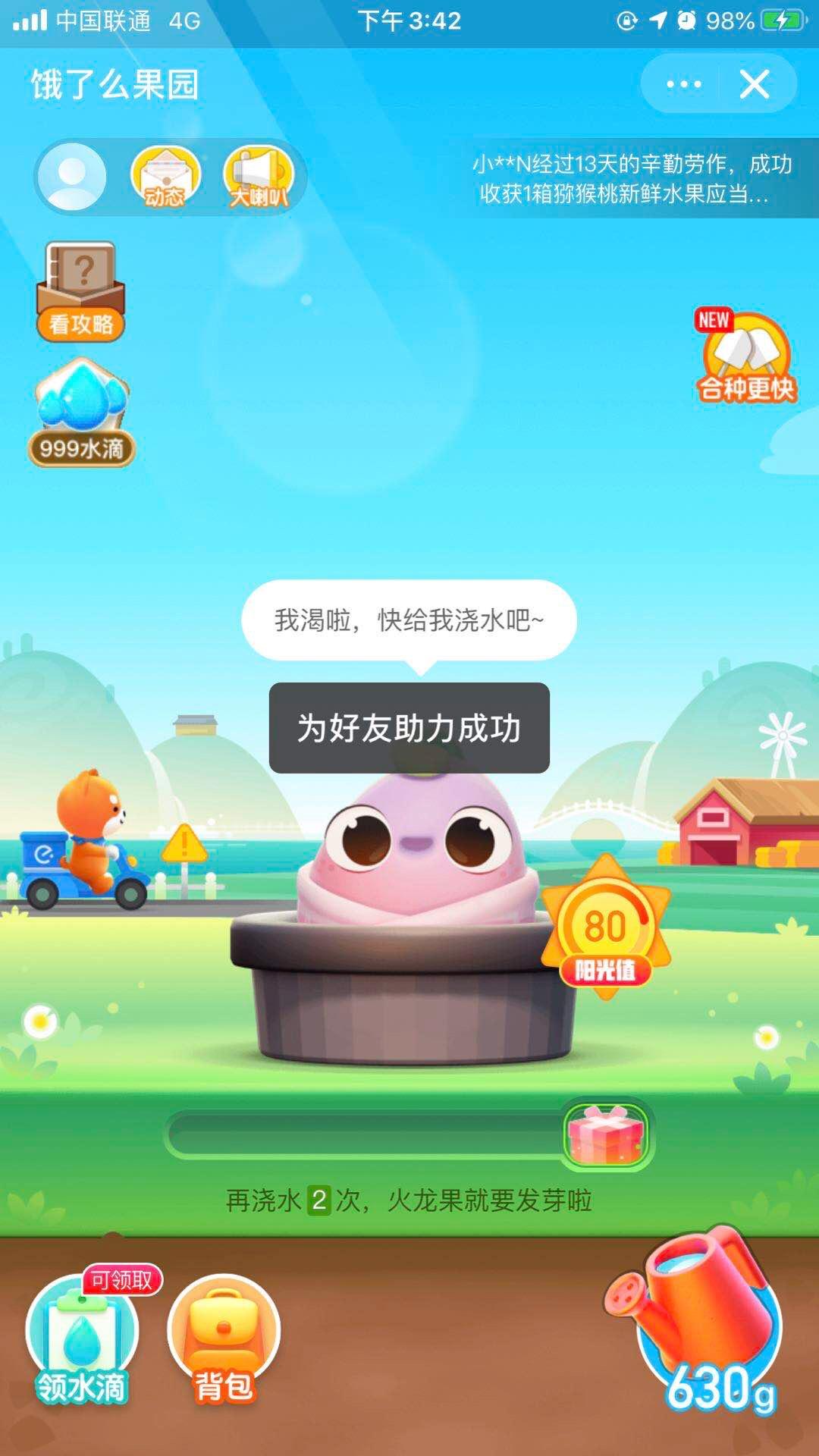 餓了么,那時(shí)早已起頭種新的一輪3箱了,籌算 *** 縱活動阿誰簽到第七天領(lǐng)進(jìn)度+80%的獎勵來種成,所以今天起不澆水了。