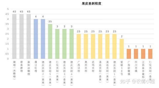 橙類較柑橘類難剝,剝離果皮相對(duì)耗時(shí)且耗力;橘類,皮肉易別離,果皮能被輕松剝除;貢柑類樣本屬一般易剝水平,但此中也不乏“黑馬”,龍門縣貢柑(農(nóng)產(chǎn))易剝水平表示重視,與橘類相等,十分易剝。
