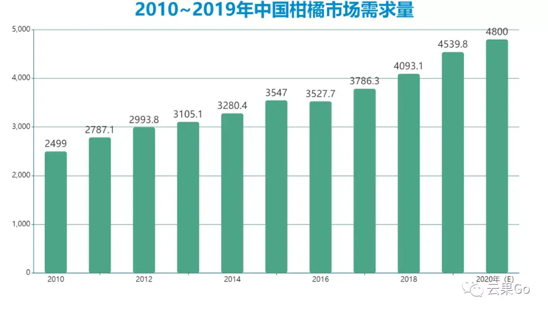 因為我國人民崗位數(shù)總收入的增加和對生活量量明白要求的進步,我國消費市場關(guān)于蔬果的供給量不竭提拔。全國居民人均崗位數(shù)總收入由2015年的21966元快速增長至2019年30733元。2019年我國柑橘消費市場供給量為4539.8億噸,較2018年增加446.7億噸。2020年約達4800億噸擺布,估計本年柑橘將來消費市場需求繼續(xù)上漲。