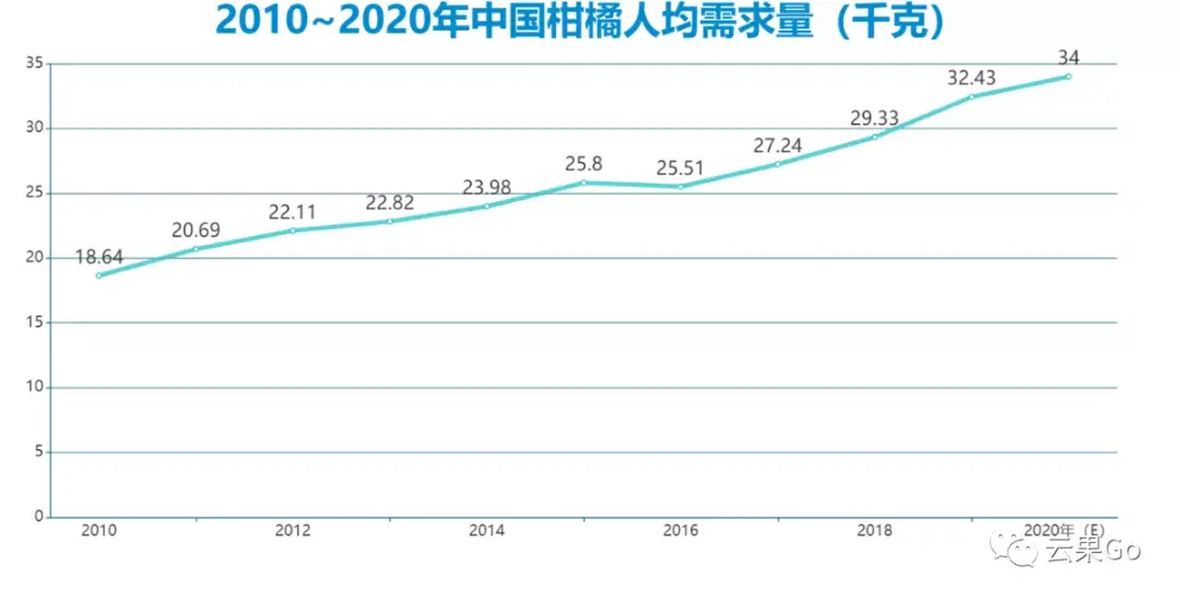 2010-2019年我國柑橘消費市場人均需求也穩(wěn)健快速增長,2010年我國柑橘消費市場人均需求為18.64千克/人,2019年我國柑橘消費市場人均需求達至32.43千克/人。